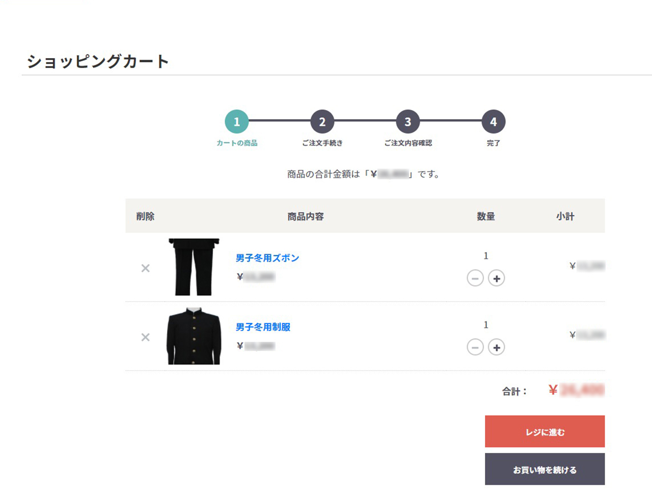 カートに入っている商品が一覧表示されます。お間違いなければ、「レジに進む」ボタンを押してください。