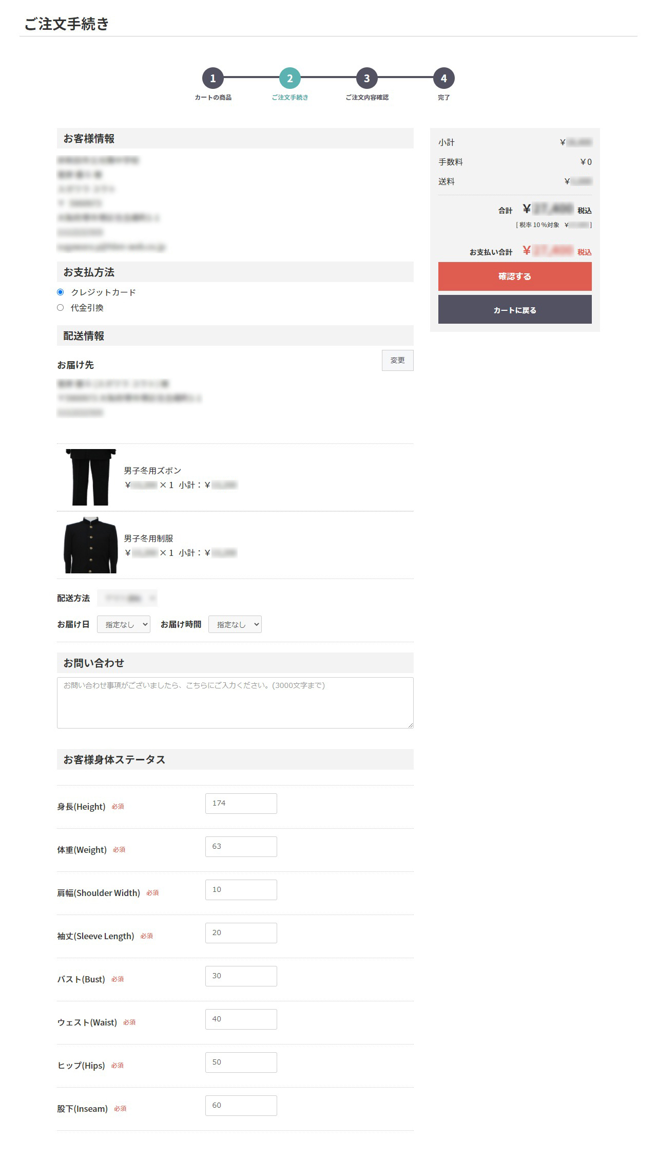 また、学校関連商品をお買い求めの方は、身体ステータスの入力をお願いしております。